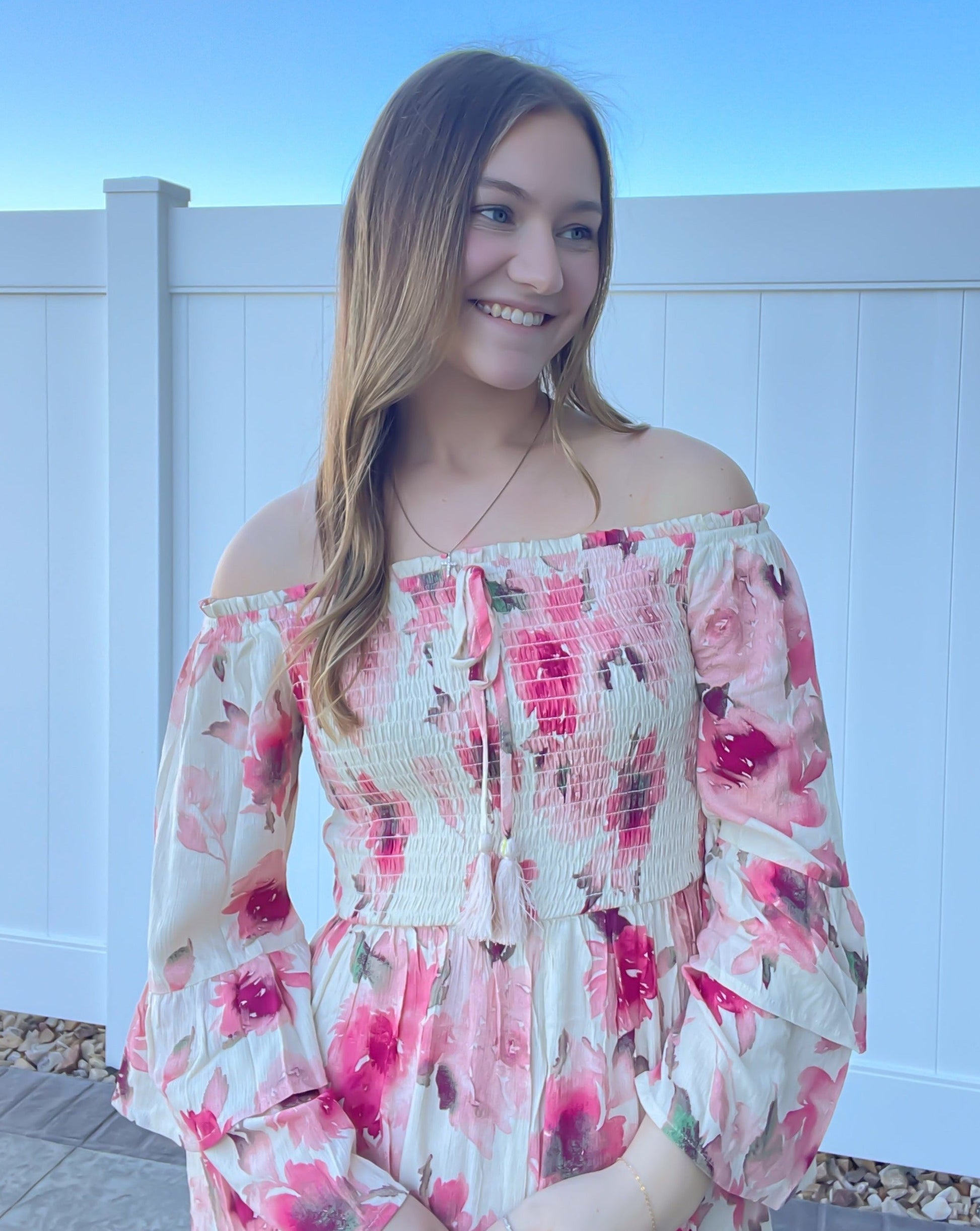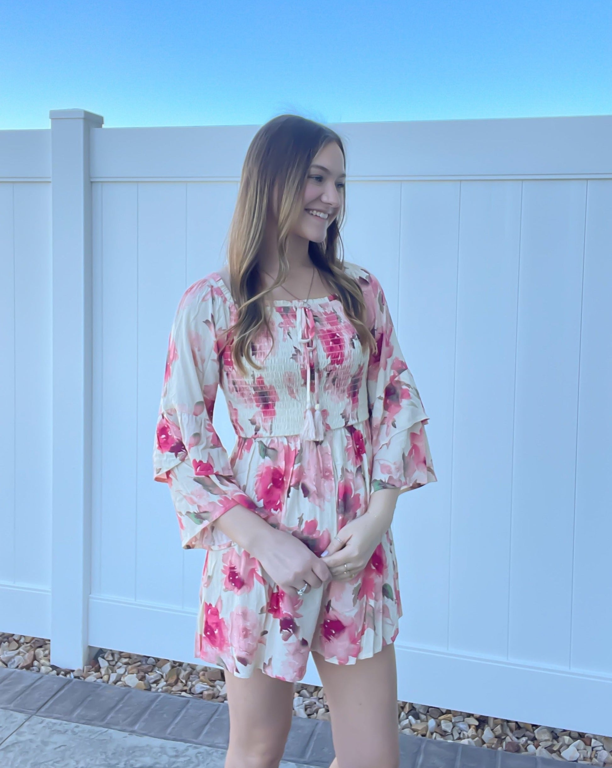 This adorable smocked, floral, romper can be worn on the shoulders or off the shoulders. Great for brunch with the girls, a fun day walking the beach, or wear it as an everyday, elevated look.