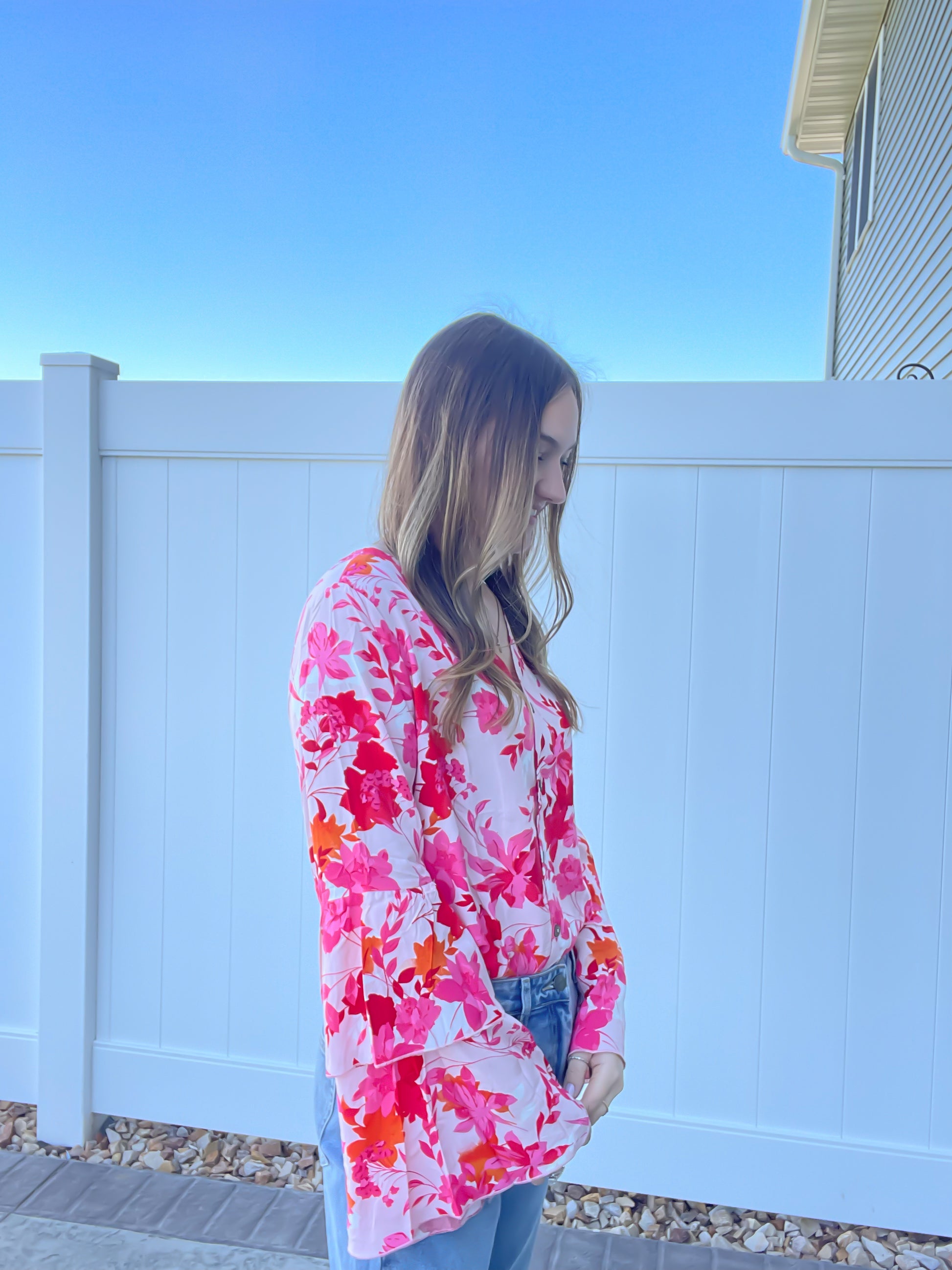 Its tier-ruffled bell sleeves provide a girlish and fun style. The v-neckline adds sophistication and poise for any occasion. Its button-up design offers a wide range of styling options and ease of use. Great for a day date or a slightly elevated everyday look.