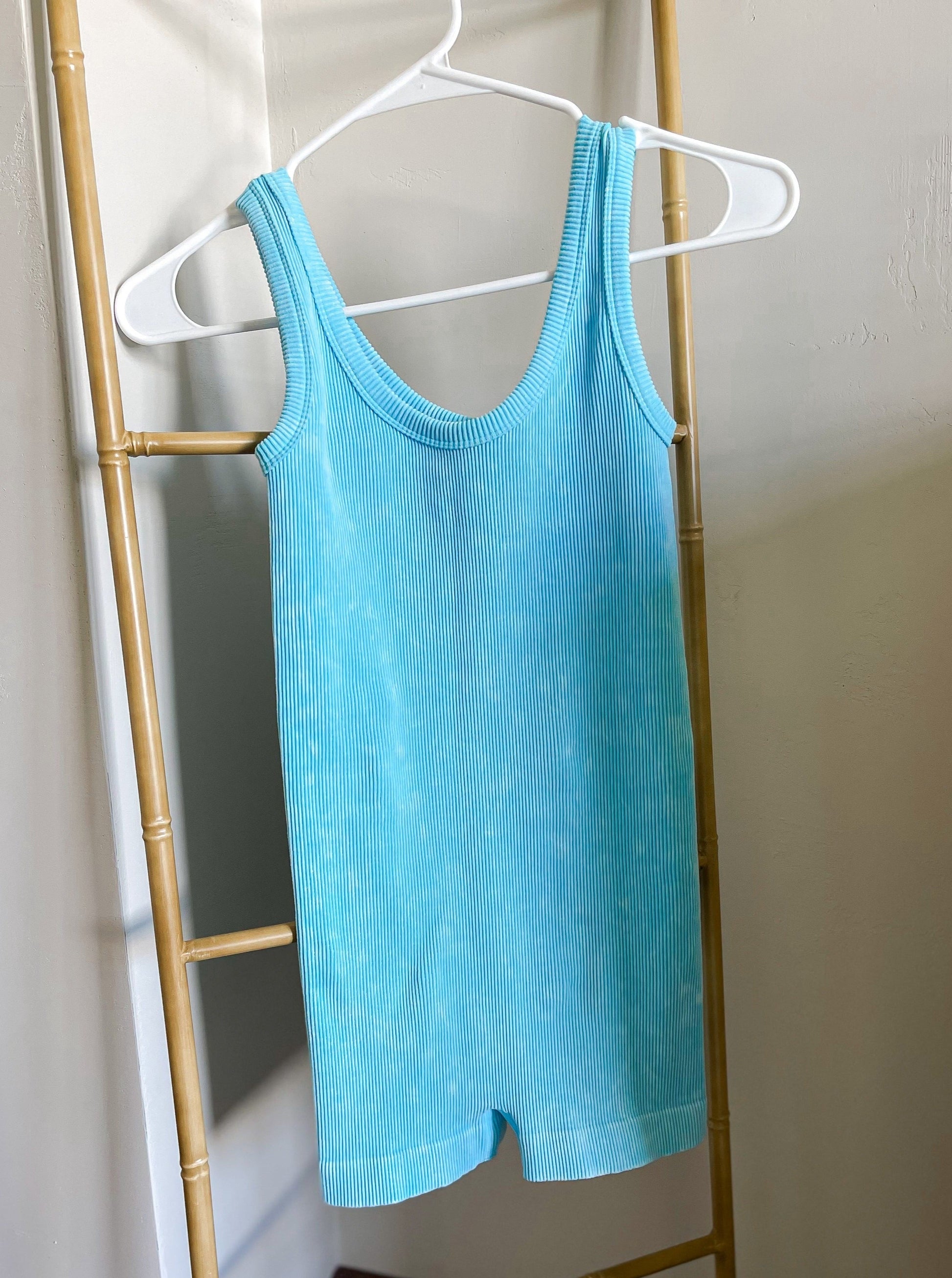 This mineral wash, ribbed, seamless active romper is great for styling under a graphic tee. Wear it as everyday attire or comfortably wear it to the gym. This romper is very stretchy and has a lot of give.